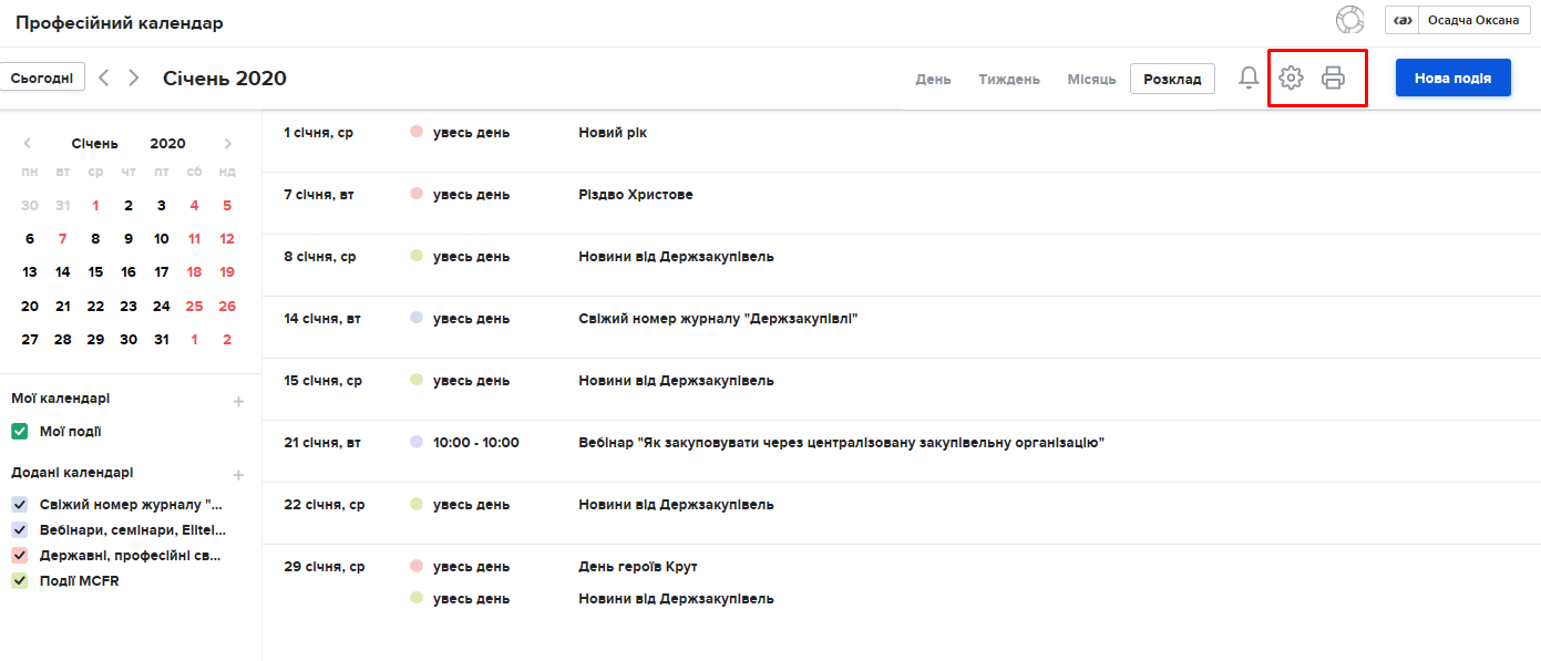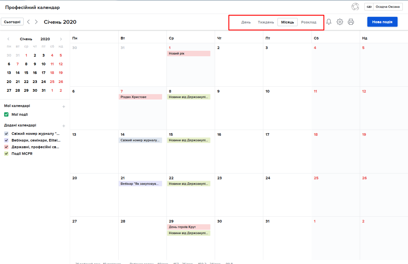 Ви можете переглядати справи, заплановані на день, тиждень або місяць. Для цього виберіть період, який вас цікавий, у верхній частині календаря.